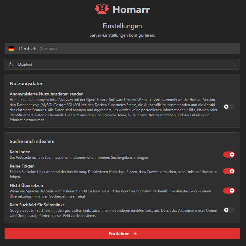 Im nächsten Fenster geben wir einige Einstellungen an. Zuerst können wir anhaken, ob unsere Nutzungsdaten anonym verarbeitet werden sollen. Der Block darunter ist eher dafür gedacht, wenn unser Dashboard öffentlich erreichbar ist.