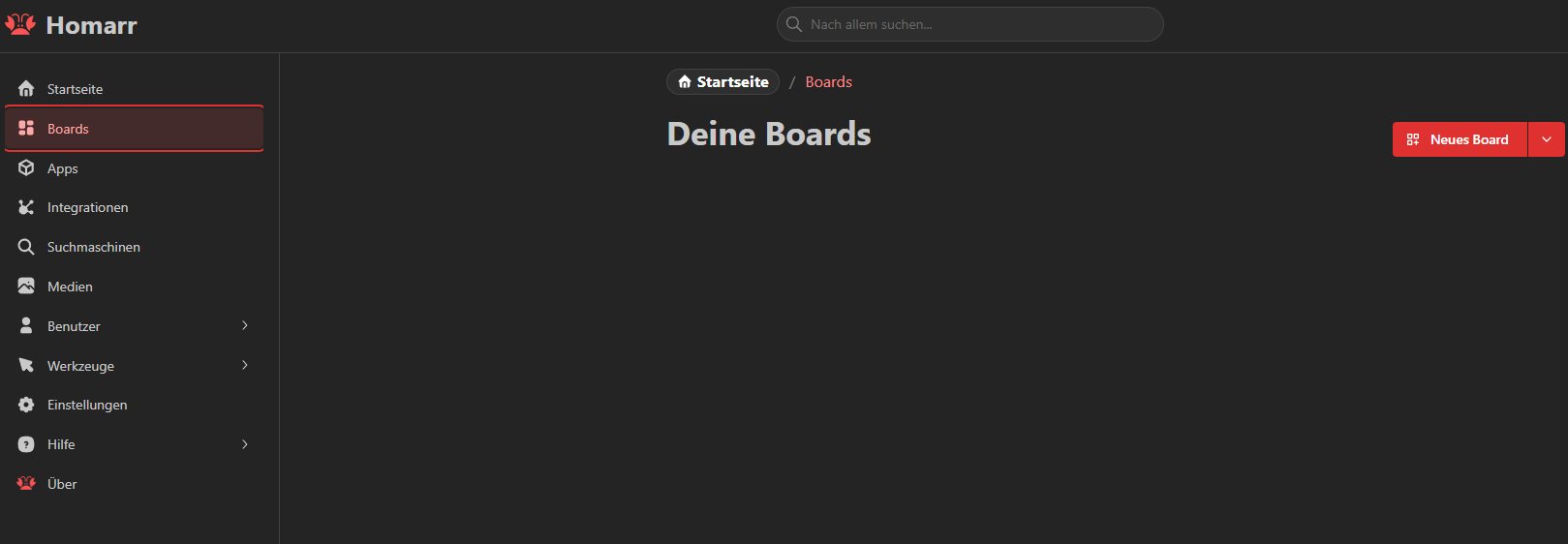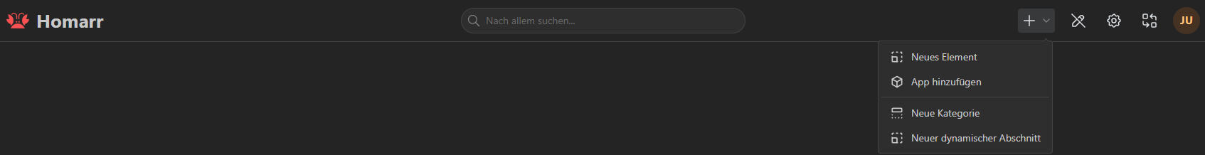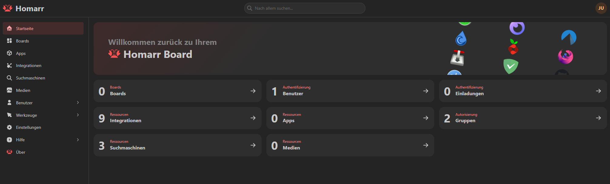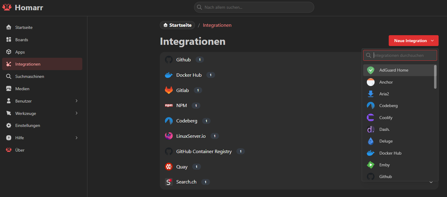 In Homarr angekommen, haben wir ein kleines Menü, in dem wir alle Einstellungen vornehmen, neue Boards erstellen, Apps hinzufügen und Integrationen konfigurieren können.