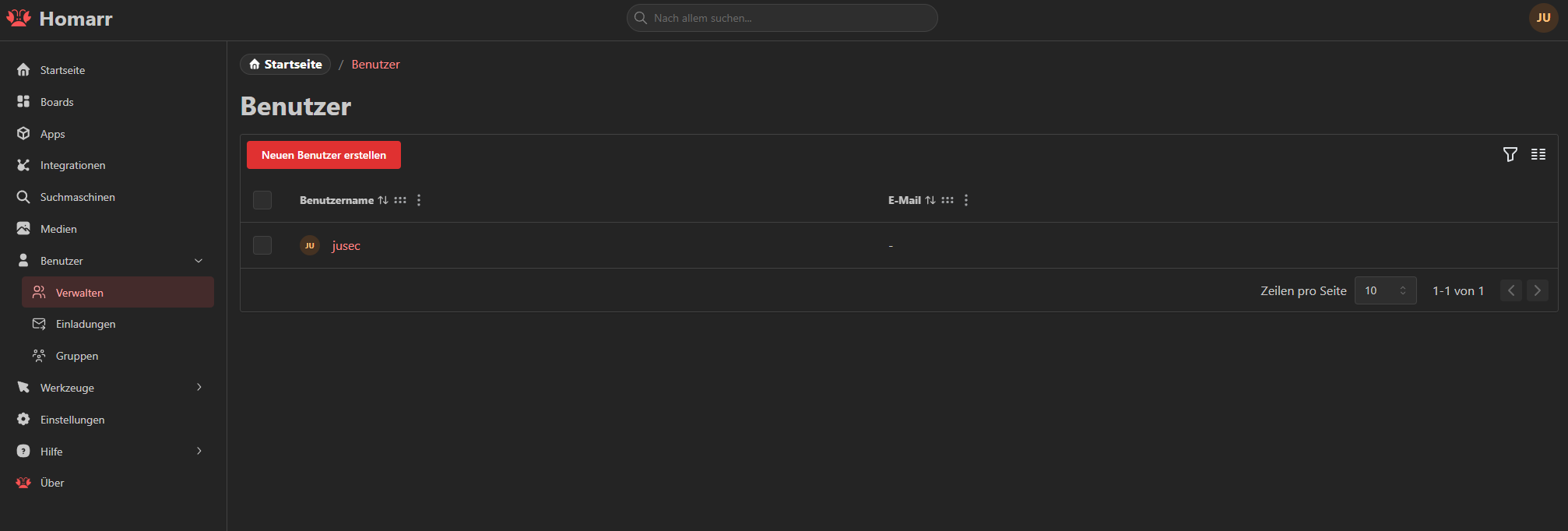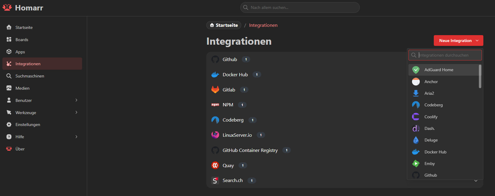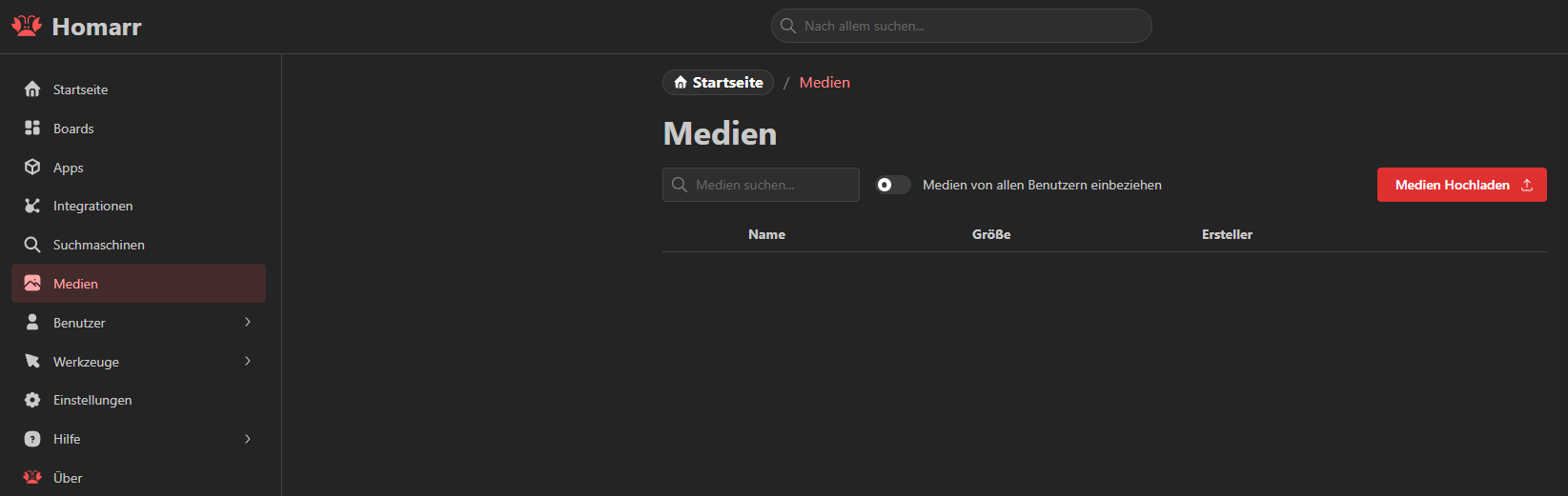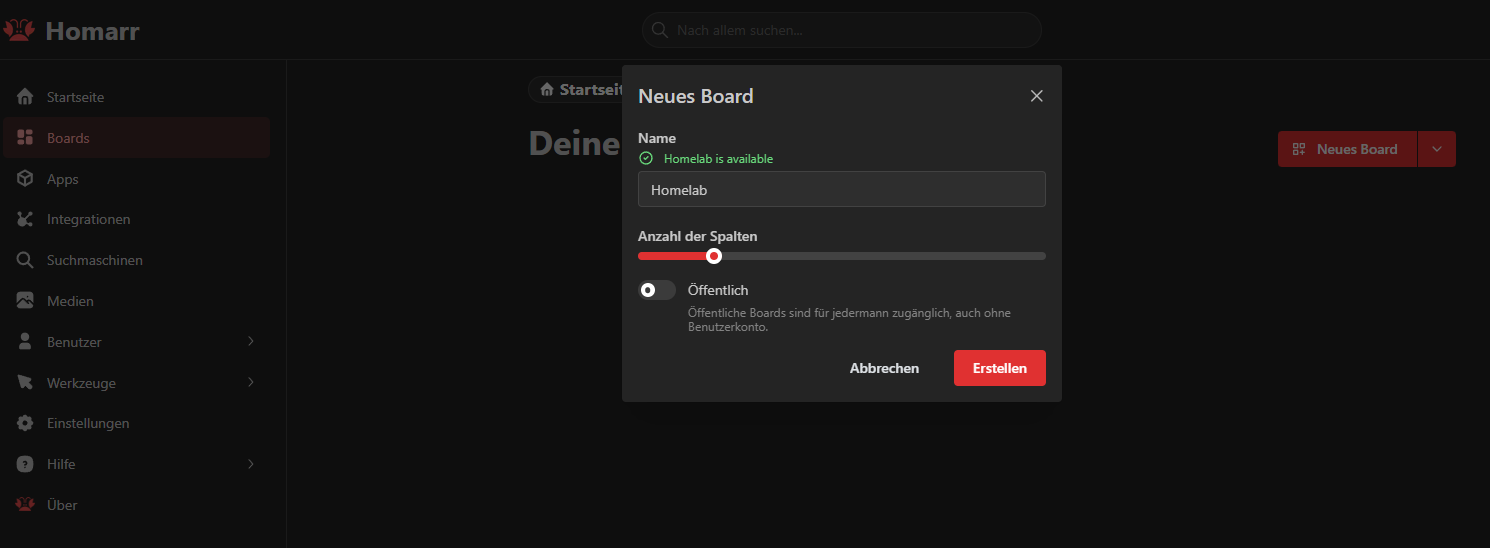 In Homarr angekommen, haben wir ein kleines Menü, in dem wir alle Einstellungen vornehmen, neue Boards erstellen, Apps hinzufügen und Integrationen konfigurieren können.