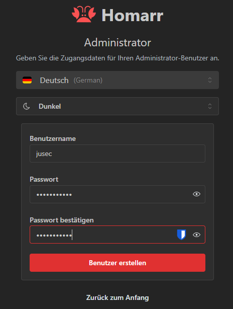 Mit Klick auf Von vorne beginnen kommen wir zu der Benutzererstellung, wo wir den Administratoraccount anlegen.