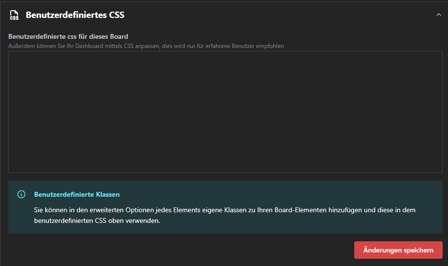 Für alle, die sich etwas mit CSS auskennen, gibt es hier die Möglichkeit, eigenen CSS-Code zu verwenden, um das Dashboard noch schöner zu machen.