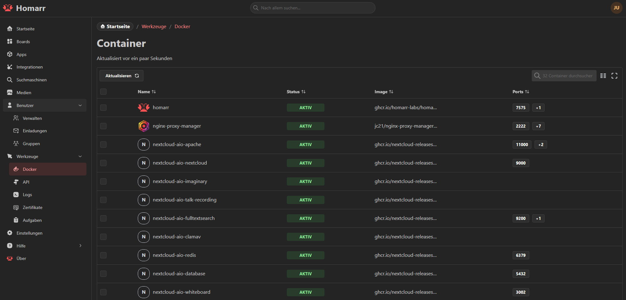 Hier haben wir ein paar kleine Tools für die Verwaltung. Bspw. sehen wir die Docker-Container auf dem Host, Logs und einiges mehr.