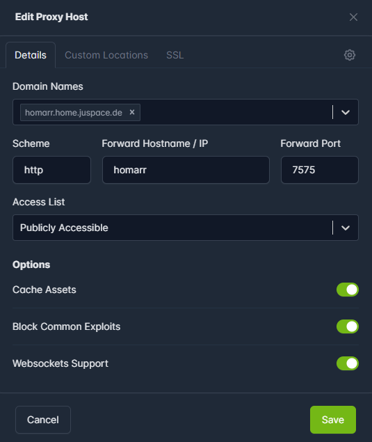 Um jetzt Homarr erreichen zu können, haben wir bereits das reverse-proxy Docker-Netzwerk zu dem Container hinzugefügt. Nun können wir im Nginx Proxy Manager einfach einen neuen Host mit dem entsprechenden Containernamen hinzufügen und geben den eigentlichen Port an.