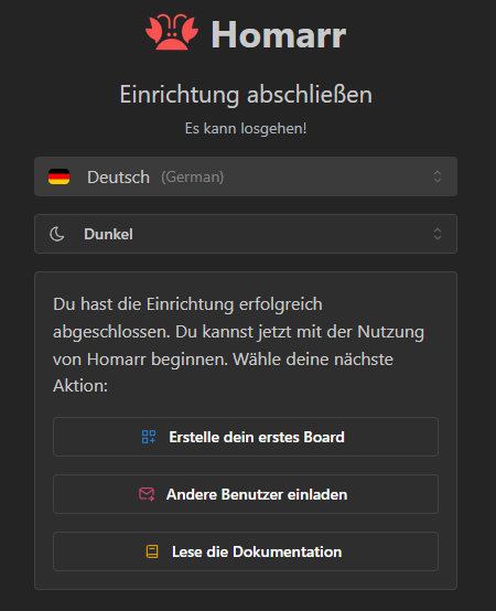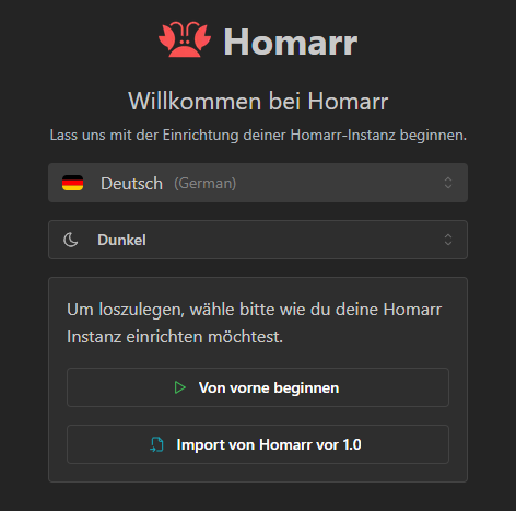 Wenn wir jetzt zu der neu vergebenen Domain navigieren, landen wir bei dem initialen Setup von Homarr. Hier können wir jetzt das Setup durchlaufen oder auch ein Backup einspielen.