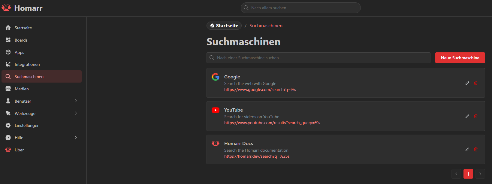 Hier können wir Suchmaschinen anlegen, die wir ebenfalls dann in unsere Boards mit einarbeiten können.