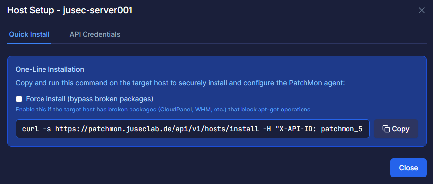 Nach Klick auf Create Host erhalten wir einen Befehl, den wir nun auf dem Host ausführen müssen, um den Agent zu installieren.