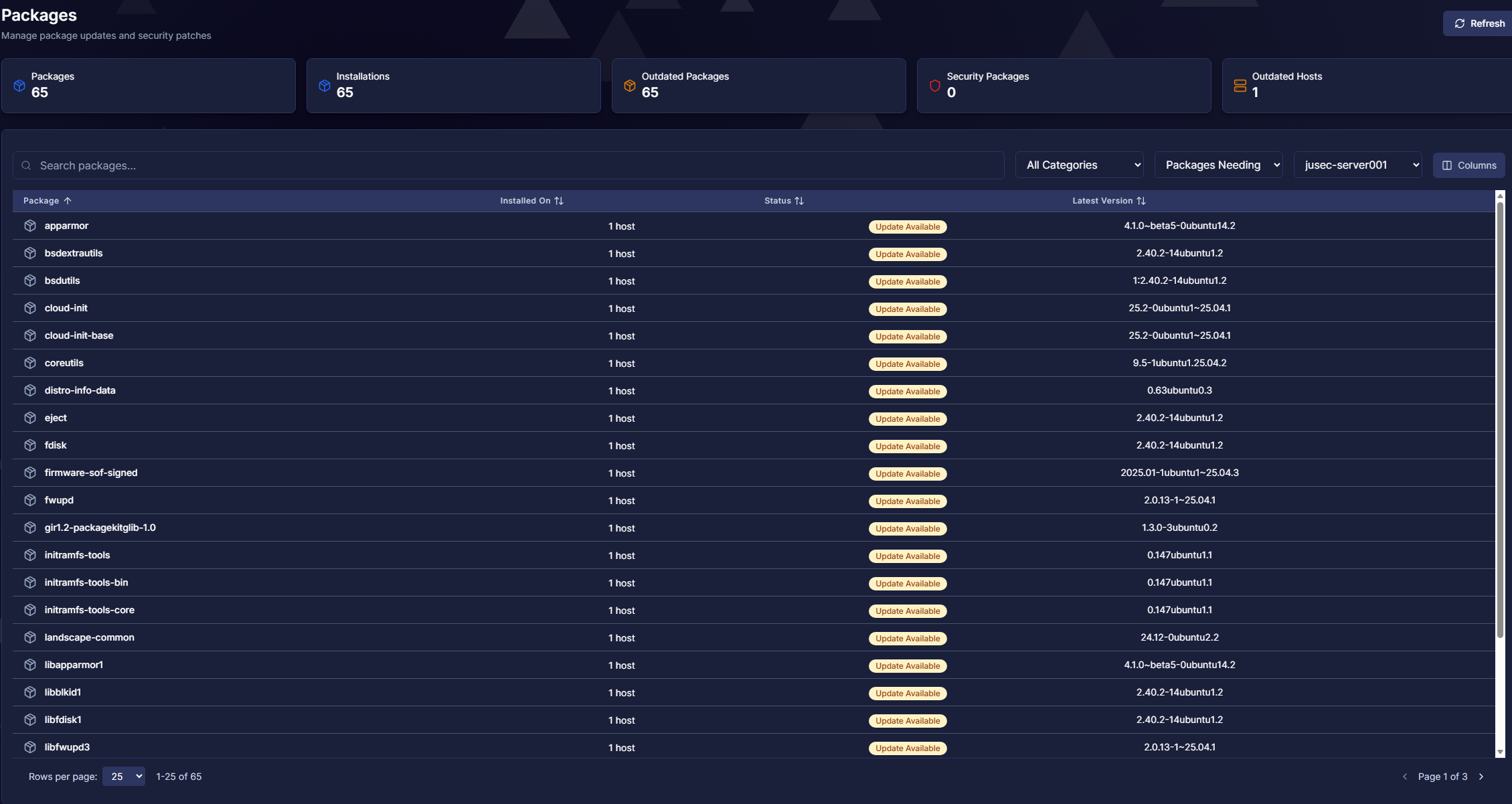 Wenn wir auf den Host klicken, sehen wir eine Übersicht über installierte Pakete und wie viele davon ein Update benötigen.