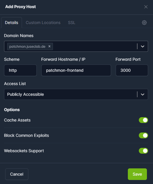 Um jetzt Patchmon erreichen zu können, haben wir bereits das reverse-proxy Docker-Netzwerk zu dem Frontend-Container hinzugefügt und in der CORS_ORIGIN Variable die gewünschte Domain angegeben. Nun können wir im Nginx Proxy Manager einfach einen neuen Host mit dem entsprechenden Containernamen hinzufügen und geben den eigentlichen Port an.