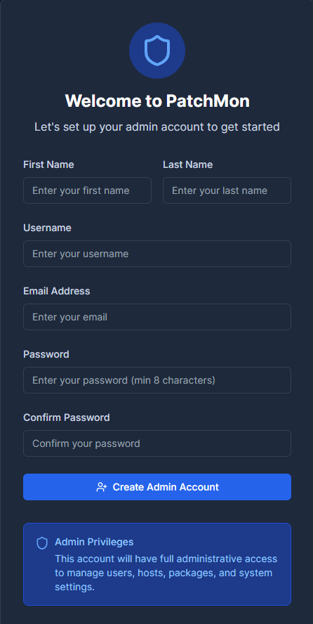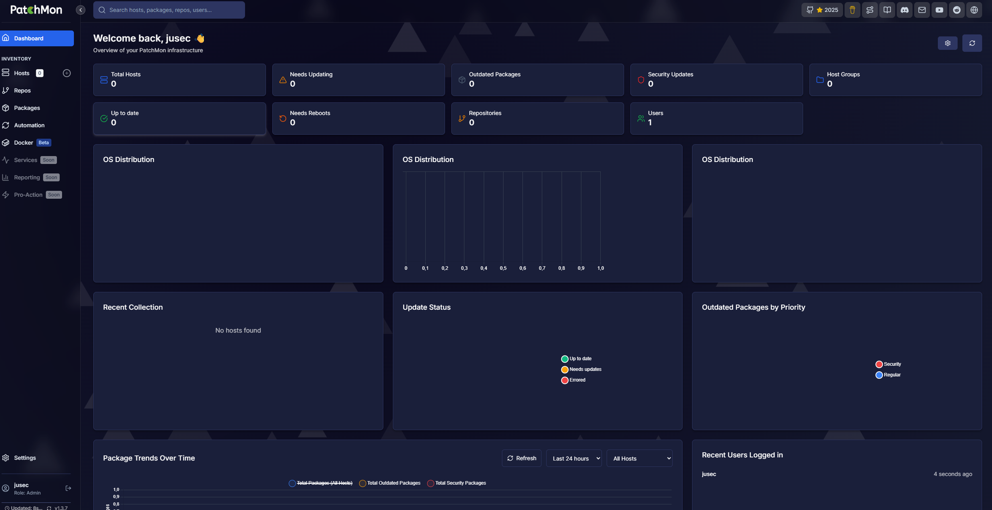 Nachdem wir unseren Benutzer erstellt haben, landen wir auch schon auf dem Dashboard von Patchmon. Hier sehen wir später alle benötigten Informationen.