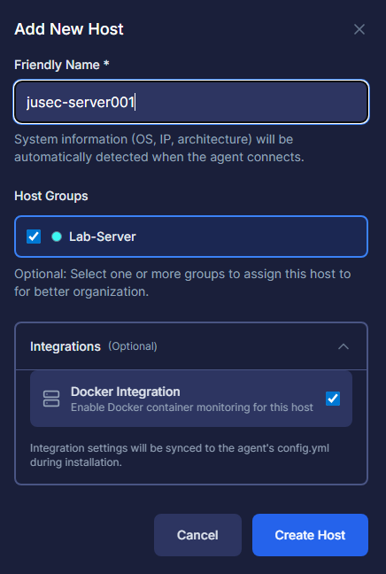 In dem sich öffnenden Fenster geben wir nun einen Friendly Name für den Server an, womit wir ihn in Patchmon erkennen. Dann können wir den Server direkt in Gruppen zuweisen, falls vorhanden, und unter Integration noch wählen, ob eventuell darauf vorhandene Docker-Container auch überprüft werden sollen.