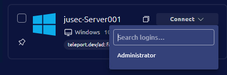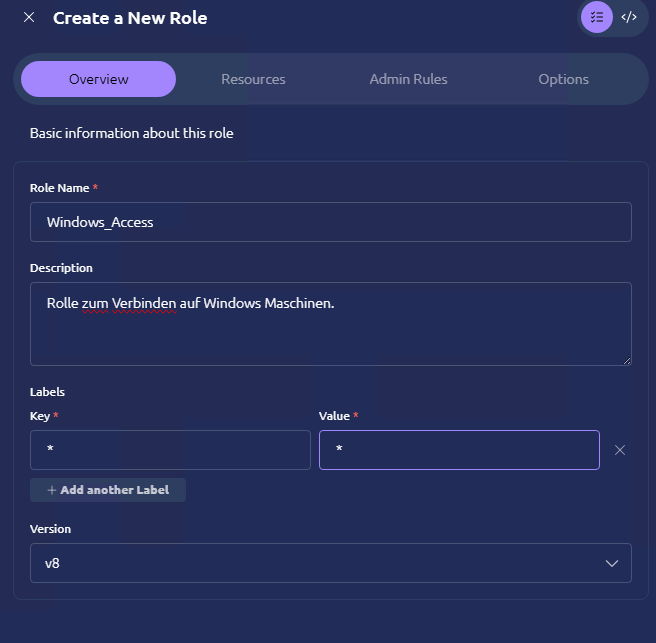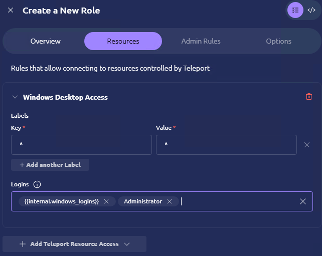 Bei dem Reiter Resources fügen wir Windows Desktop Access hinzu, wählen nochmal unsere Label, mit denen wir die Rolle auf verschiedene Ressourcen aufteilen könnten, und geben die Logins ein, die wir auf den Windows-Systemen verwenden möchten.