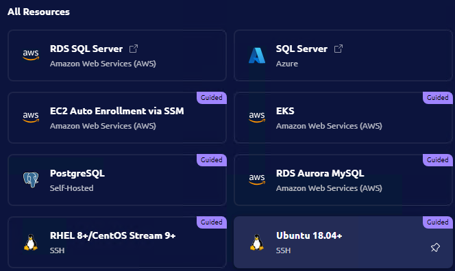 Eine Linux-Ressource hinzuzufügen, benötigt weniger Schritte und es gibt ein "geführtes" Setup dafür. Wir gehen zuerst auf "Enroll New Resource" und suchen, in meinem Fall, Ubuntu.