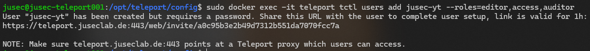 sudo docker exec -it teleport tctl users add jusec --roles=editor,access,auditor