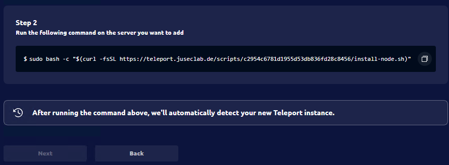 Im 2. Schritt erhalten wir einen Befehl, den wir auf dem System, das wir hinzufügen wollen, ausführen müssen. Nach dem Ausführen meldet sich das System dann bei Teleport und wir können mit der Einrichtung fortfahren.