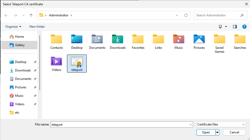 Im geöffneten Explorer wählen wir jetzt das heruntergeladene Teleport-Zertifikat aus.