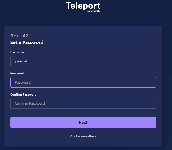 Beim Link angekommen, können wir uns nun entweder ein Passwort hinterlegen oder via "Go Passwordless" direkt einen Passkey hinterlegen.